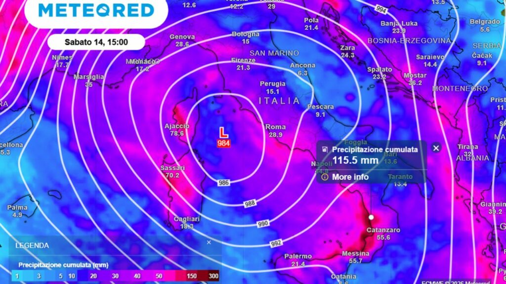 “Tale sistema frontale è collegato ad una più ampia depressione extratropicale, con minimo sotto i 980 hPa posizionato sul Nord della Francia. Durante la giornata di sabato 14 questo vasto ciclone attraverserà il territorio francese, per raggiungere il Mar di Corsica, e spostarsi nelle ore successive verso il Tirreno”, afferma Daniele Ingemi, meteorologo di Meteored Italia.