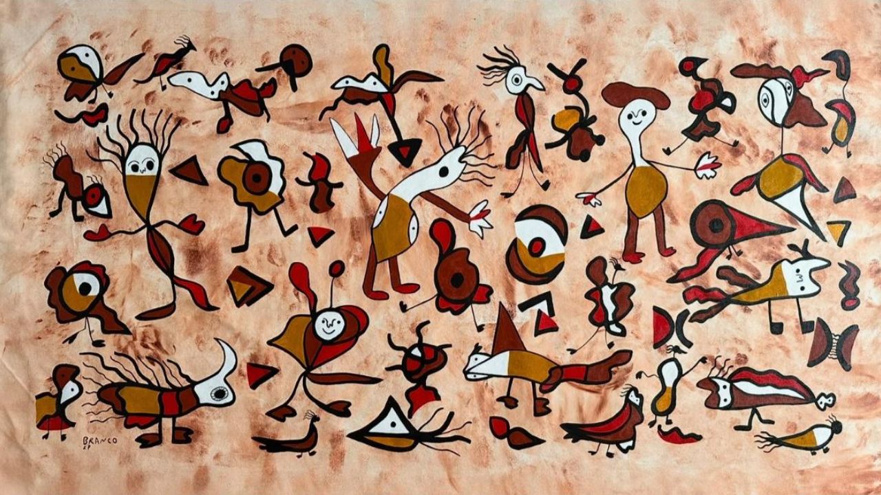 Le opere dell’artista brasiliano Branco sublimano il rapporto con la sua terra d’origine attraverso visioni espressive uniche. La sua estetica distintiva interiorizza i tratti caratteristici del paesaggio e della cultura di provenienza – come i lunghi cicli di siccità – trasformandoli in materia poetica. Da questa elaborazione nascono figure zoomorfe e fitomorfe, insieme a grafemi che danno forma a un linguaggio visivo personale. Branco costruisce così un universo autonomo, abitato da forme astratte che rimandano a un immaginario favolistico e mitico, in cui memoria, simbolo e invenzione si intrecciano.