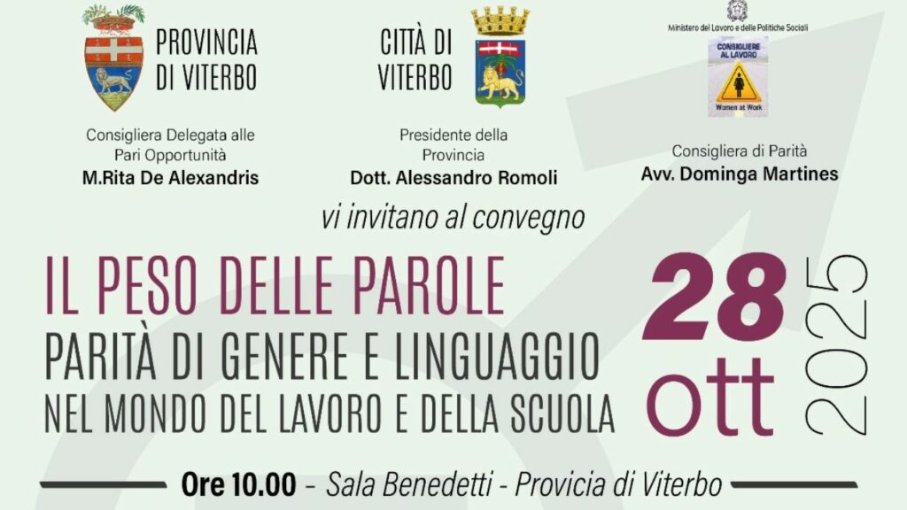 Martedì 28 ottobre alle ore 10, nella sala Benedetti della Provincia di Viterbo, si terrà il convegno “Il peso delle parole: parità di genere e linguaggio nel mondo del lavoro e della scuola”, promosso dalla consigliera di parità Dominga Martines e dalla consigliera delegata alle pari opportunità Maria Rita De Alexandris.