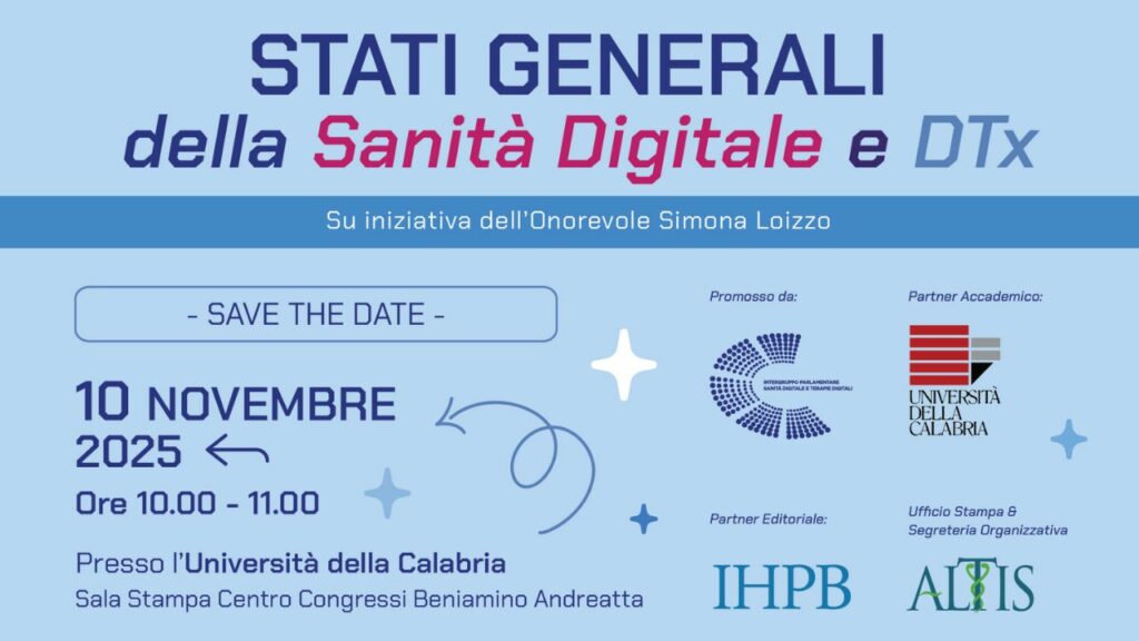 L’iniziativa è promossa dall’Intergruppo Parlamentare Sanità Digitale e Terapie Digitali, in collaborazione con l’Università della Calabria e la rivista di politica sanitaria Italian Health Policy Brief (IHPB). L’obiettivo è presentare i contenuti e le finalità della seconda edizione degli Stati Generali della Sanità Digitale e delle Terapie Digitali (DTx), che si confermano come punto di riferimento nazionale per il confronto tra istituzioni, università e imprese.