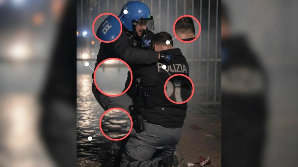 Il 1° febbraio, la Polizia di Stato pubblica sui propri profili social un post di solidarietà agli agenti feriti. L’immagine scelta è proprio quella dell’abbraccio tra Virgulti e Calista. Ma basta osservarla con attenzione per cogliere una serie di anomalie tipiche delle immagini IA: scritte senza senso sul casco, la parola “Polizia” deformata sul corpetto, errori nelle proporzioni, dettagli che non tornano.